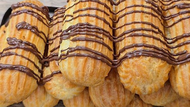 НЕЖНЫЕ ЭКЛЕРЫ. Мой любимый десерт. Рецепт: 125 мл воды, 125 мл молока, щепотка соли, 10 г сахара, 125 г сливочного масла (82,5%), 150 г муки, 4 яйца категории С0. В сотейник выложить соль, сахар, сливочное масло, влить воду и молоко, довести до кипения. Добавить муку и держать на огне, перемешивая, пока масса не станет однородной. Переложить в чашу миксера и остудить примерно 3–4 минуты. Добавлять яйца по одному, взбивая миксером с насадкой для теста после каждого. Переложить тесто в кондитерский мешок, духовку разогреть заранее. Отсадить тесто на противень, застеленный пергаментом. Выпекать при 170 °C 25–30 минут. Крем: 200 г маскарпоне, 150 г сливок, 80 г варёной сгущёнки, 80 г растопленного шоколада (для украшения). По вопросам публикации и удаления видео просьба обращаться на почту: potaenko99@mail.ru