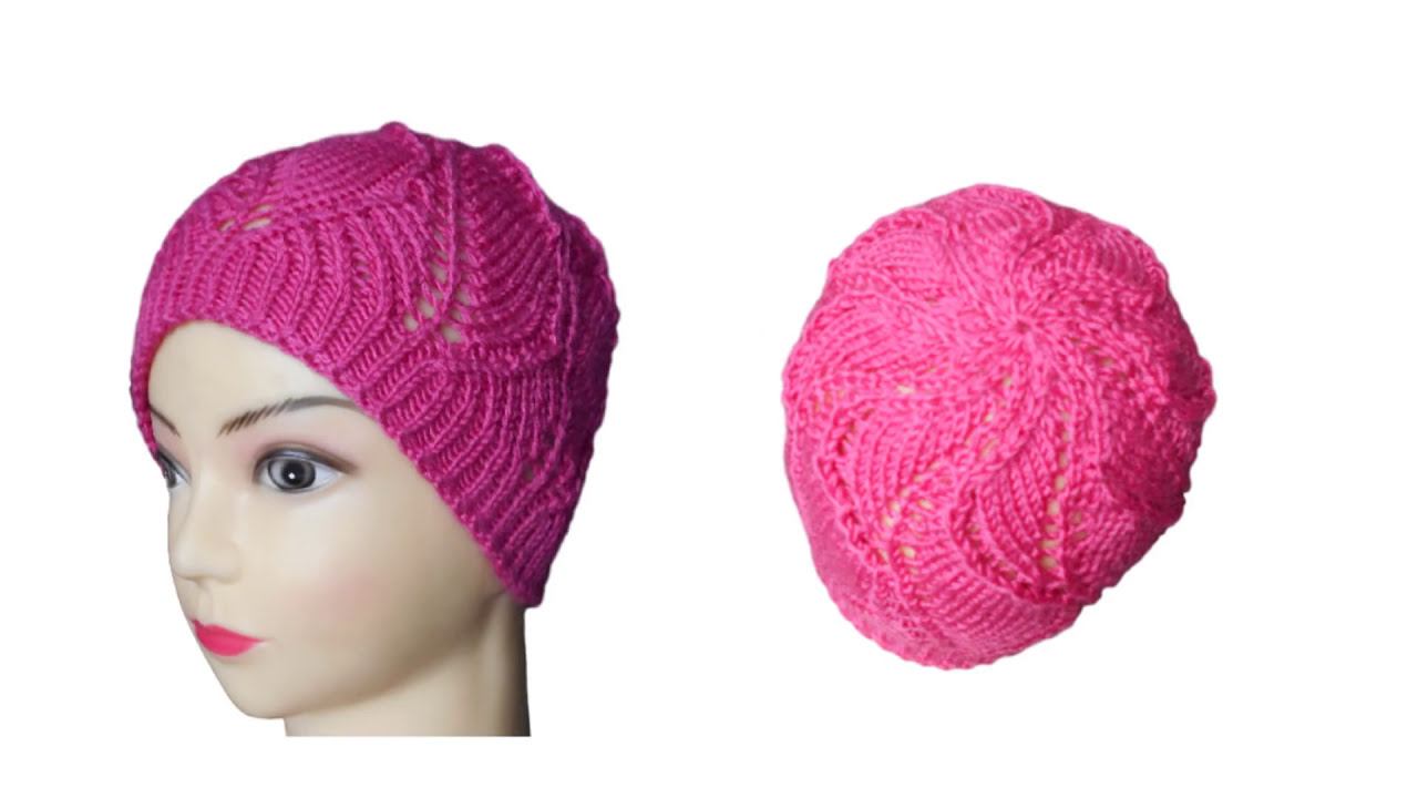 Красивая ажурная шапочка спицами с необычным узором из листьев - мастер-класс.