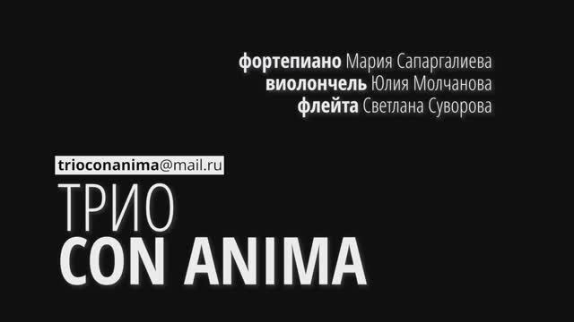 Трио CON ANIMA Создано в 2019 году, мы регулярно выступаем на концертных площадках Санкт-Петербурга и России. Участники XXXV Международного фестиваля старинной и современной камерной музыки в Полоцке, в 2023 г., Международного фестиваля "Флейта-пикколо", Санкт- Петербург, 2023г. CON ANIMA лауреат международных конкурсов King's Peak International Music Competition (3-е место) и World Classical Music Awards (1-е место). Суворова Светлана, флейта: выпускница СПб консерватории, класс з.а. России Чернядьевой О.С.; солистка оркестра театра «Санкт-Петербург Опера». Молчанова Юлия, виолончель: выпускница СПб консерватории, класс з.а. России Чернядьева С.И.; концертмейстер группы виолончелей СПб ГАСО. Сапаргалиева Мария, фортепиано: выпускница СПб консерватории и аспирантуры, класс з.а. России Серёгиной Н.Н.; концертмейстер СПб консерватории и педагог