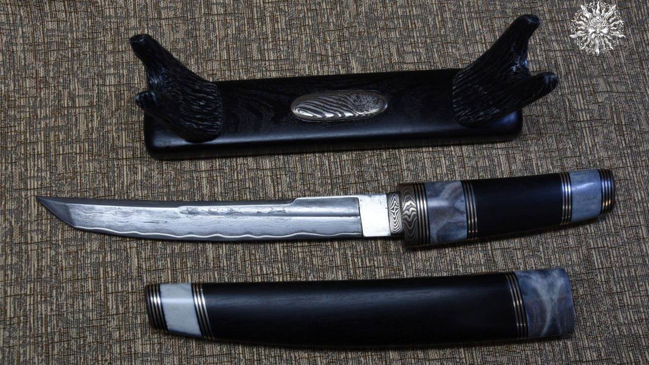 Клинок ламинат Вячеслава Потанина, S390 в 95х18 через никель, рукоять 145 мм, общая длина 390 мм, длина в ножнах 410 мм, мокуме, бронза, нейзильбер, стабилизированный рог лося, стабилизированный граб, G10. Подставка граб, рог лося, мокуме, кожа.