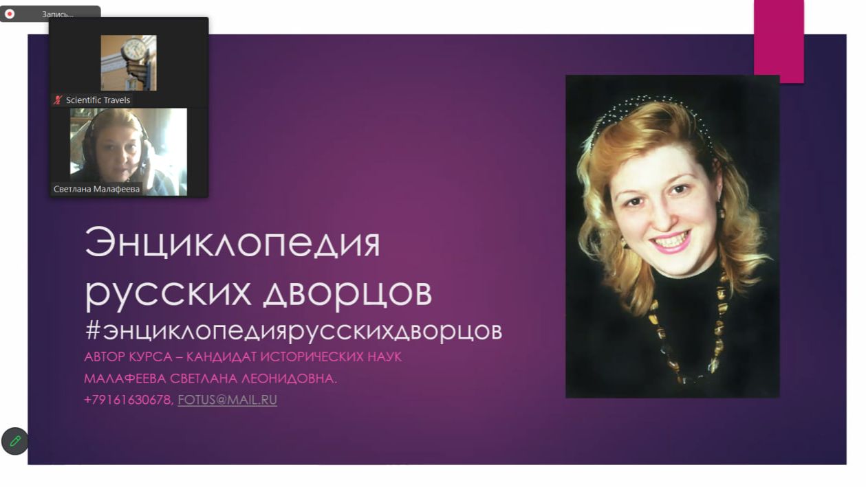 Светлана Малафеева: Энциклопедия русских дворцов Мой проект «Энциклопедия русских дворцов» начался с научного исследования. Моя кандидатская диссертация посвящена истории русских дворцово-парковых ансамблей. На основании материалов диссертации были подготовлены авторские экскурсии по Москве. В 2019 году в группе «Экскурсовет» появилась идея создания тематических групп. Во время карантина я открыла канал «Энциклопедия русских дворцов». В настоящий момент он размещается в социальных сетях Telegram и Вконтакте В рамках канала были проведены онлайн-лекции и онлайн-экскурсии по истории русских дворцов. Также прошло выступление в лектории союза экскурсоводов. Развитие проекта продолжилось при проведении лекций по истории дворцов в музее авиации и космонавтики с использованием онлайн вещания. С помощью канала осуществляется общение с подписчиками и идет подготовка новых маршрутов. Также проводятся рекламные кампании с использованием хэштега #энциклопедиярусскихдворцов. Позже были созданы еще две специализированные группы Канал имени Москвы и Я шагаю по стране. https://vk.com/club234554166 https://t.me/canalmoscow https://t.me/yashagaupostrane