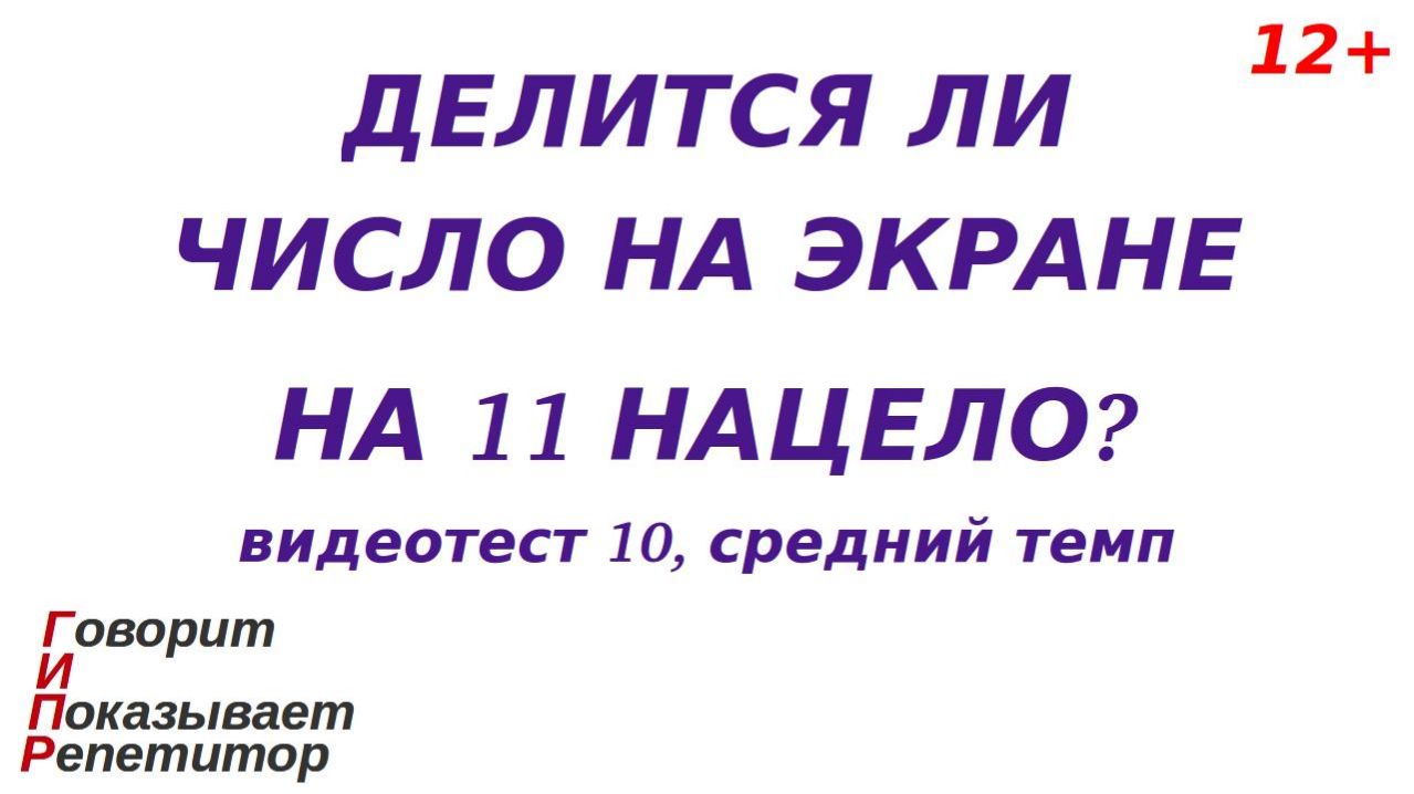 Категория 12+. Этот видеоролик - основа эпизода игры в репетитора и ученика и позволяет тренироваться применять признак делимости на 11 нацело (без остатка). Правила игры в этом эпизоде такие: после запуска видео репетитор-компьютер (планшет, смартфон, телевизор) показывает (отображает) на экране число, а вопрос репетитора следующий: "Делится ли изображенное число на 11 нацело?". Игрок-ученик должен дать ответ (вслух или про себя). Через некоторое время на экране появляется правильный ответ, с которым нужно сравнить свой собственный. Затем показывается следующее число и т. д. Цель игрока-ученика - дать как можно больше правильных ответов. Если все ответы верные, это считается абсолютной победой ученика в этом эпизоде игры. Я рекомендую это видео в первую очередь детям, осваивающим тему "Признаки делимости нацело". Таким образом, ролик представляет собой игровой видеотест, имеющий общие черты с программой-тренажером, дающей онлайн примеры и ответы на них. Показ числа длится 5,0 секунды, а ответа - 1,5 секунды. Это, на мой взгляд, средний темп. Если тема игры Вам интересна и Вы добились успехов, рекомендую попробовать свои силы при помощи других видеотестов на эту же тему в среднем или даже в быстром темпе, а если Вам кажется, что вопросы задаются очень часто и Вы не успеваете продумывать ответы, то попробуйте потренировать навыки при помощи видеотестов на эту тему в медленном темпе. Если же тема не интересна, то не забывайте - это игра и она не должна идти по принуждению. При создании ролика мной преследовалась следующая цель: дать ненавязчивый игровой материал, помогающий повторять пройденную тему детям, с которыми я, как репетитор, индивидуально вживую проводил занятия по арифметике и алгебре. При выборе примеров, времени показа примера, количества примеров в одном ролике, продолжительности ролика, используемых цветов и других параметров в первую очередь я полагался на результаты собственных наблюдений, полученных в процессе указанных занятий. А именно, конкретизирую, перечисленные и другие параметры выбраны так, чтобы на протяжении одного эпизода игры (времени показа одного видео) игрок-ученик мог давать больше половины правильных ответов и при этом не уставал. При таком подходе к созданию ролика главное, чего я добился в своей практике общения с указанными выше детьми, состоит в следующем: каждый игровой эпизод не вызывал отторжения, а наоборот, настраивал на продолжение игры, а, значит, на очередную тренировку вычислительных навыков без постороннего принуждения. Поскольку предлагаемая игра подразумевает развитие навыков, применяемых в образовательном процессе ребенка, ролик отнесён к категории "Образование". Но я подчеркиваю - ролик не создавался как образовательный материал, соответствующий государственным стандартам в сфере образования, методическим указаниям и рекомендациям для образовательного процесса, т. е. образовательным материалом он не является. Также, по моему мнению и отзывам некоторых моих подписчиков, результат моей работы оказался полностью или частично подходящим ответом на такие популярные поисковые запросы, как: - признак делимости на 11; - признак делимости чисел на одиннадцать; - математика признаки делимости; - упражнения на признаки делимости; - признаки делимости натуральных чисел. Я выкладываю этот видео