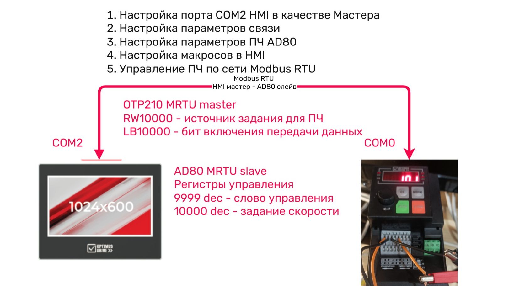 Управление ПЧ AD80 по Modbus RTU с помощью панели оператора OTP210 и ПИД регулирования
