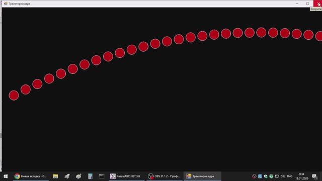 PascalABC, GraphABC. Построение траектории ядра. program Yadro; uses graphabc; var g,pi,y0,t,a,v,vx,vy,x,y:real; c:color; begin c:=rgb(0,0,0); {чёрный цвет} setwindowcaption ('Траектория ядра'); setwindowsize (1366,768); {Размеры окна} setwindowpos (0,0); {Положение окна} clearwindow (c); {Очищаем экран} g:=9.8; pi:=3.141592653; y0:=2; {Начальная высота. Рост спорсмена} t:=0; {Время} a:=50; {Угол. Градусы} v:=14; {Начальная скорость. м/с} vx:=v*cos(a/180*pi); vy:=v*sin(a/180*pi); x:=0; y:=y0; c:=rgb(255,255,255); {Уст белый цв} setpixel (trunc(x),trunc(-y*50+500),c); {Начальная точка траектории. y - c переворотом и смещением} setpencolor(rgb(255,255,255)); {Цвет окружности} setbrushcolor(rgb(190,0,0)); {Цвет заливки окружности} while y﹥0 do begin {Пока ядро не упало повторять} t:=t+0.05; {Шаг по времени, сек} x:=x+50; {шаг по x} y:=y0+vy*t-g*t**2/2; {setpixel(trunc(x),trunc(-y*50+500),c); {y - c переворотом и смещением} circle(trunc(x),trunc(-y*50+500),20); end; end.