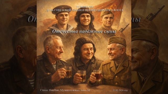 Отечества надёжные сыны. Автор стихи: НикНик; Музыка и вокал: Suno AI 22.02.2026 год. Сегодня повод есть обняться словом, Хоть разбросали нас по карте города. Мы все верны тем клятвам и основам, Что в юности давали — навсегда. Один берёг морские горизонты, Другой в песках заставы охранял, Но все мы были — общей силы фронтом, И каждый за страну свою стоял. Неважно — в танке ты, в тельняшке или в небе, Мы все одной присяге преданно верны. И где бы каждый в этой жизни прожит не был — Мы остаемся сыновьями той большой страны! Пусть седина, но в сердце — вечная отвага, И юности далекой слышится салют. За наше братство под единым общим флагом, Который в нашей памяти и ныне берегут! Пусть сорок лет иль пятьдесят промчалось, Но та закалка в нас доселе есть. Всё лучшее, что в памяти осталось: Мужская дружба, доблесть и, конечно, честь. Мы помним марши в праздничных колоннах, И как за нас спокойна была мать. И сколько б ни было на тех былых погонах Лучей и звёзд — их блеск не потерять. Неважно — в танке ты, в тельняшке или в небе, Мы все одной присяге преданно верны. И где бы каждый в этой жизни прожит не был — Мы остаемся сыновьями той большой страны! Пусть седина, но в сердце — вечная отвага, И юности далекой слышится салют. За наше братство под единым общим флагом, Который в нашей памяти и ныне берегут! Давайте ж вспомним молодые годы, Где каждый — брат, и Родина — одна. Пусть обходят стороной невзгоды, И будет жизнь тепла и тишины полна. За всех парней! За наше поколенье! За то, что верность в сердце сберегли. Примите в этот праздник поздравленья — Защитники родной своей земли! Пусть годы мчат, но мы в строю незримом, Сквозь время слышим зов своей страны. Мы связаны одной судьбой единой, Отечества надёжные сыны!