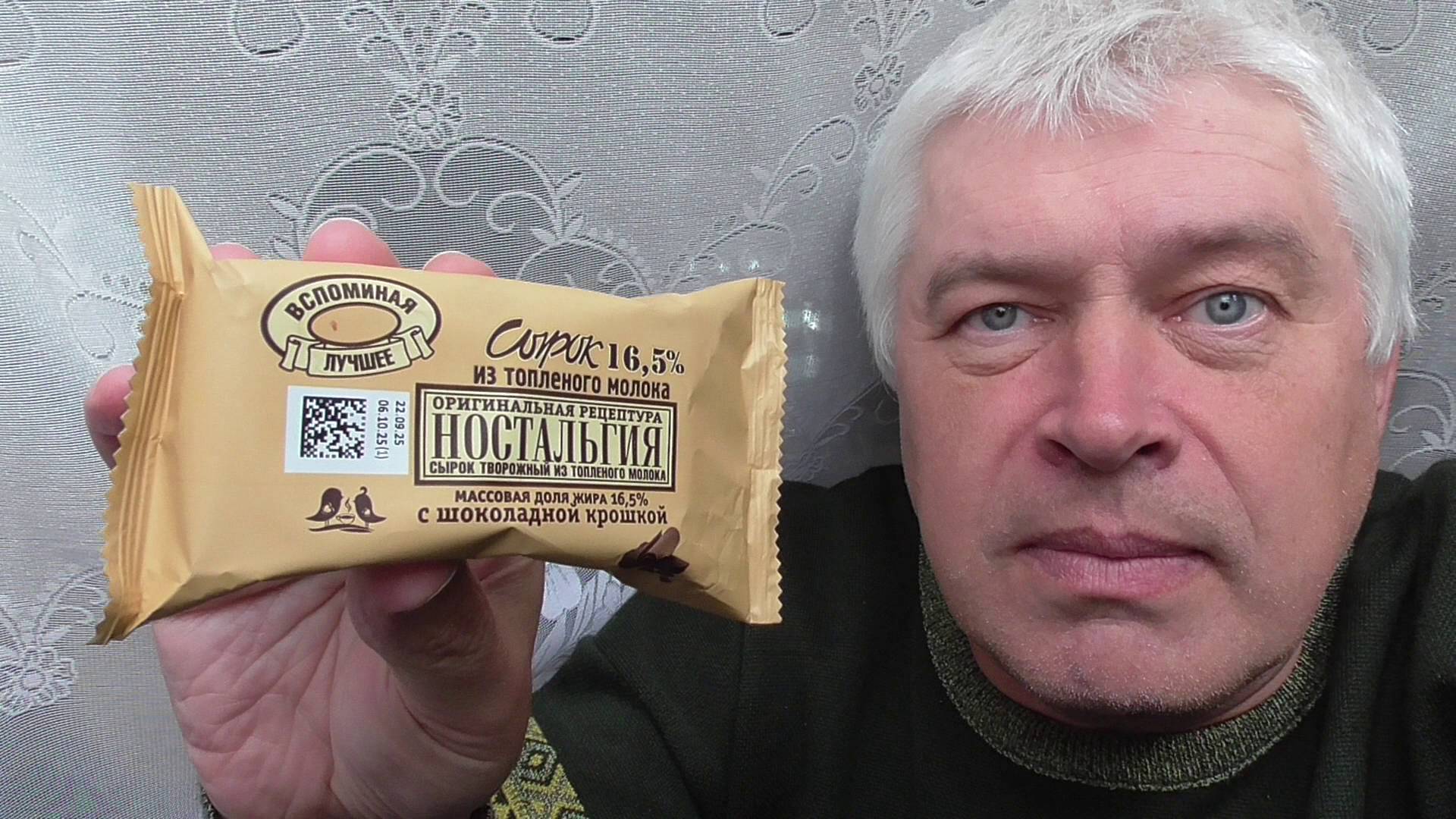 У меня сырок из топлёного молока НОСТАЛЬГИЯ с шоколадной крошкой. Я кушаю.