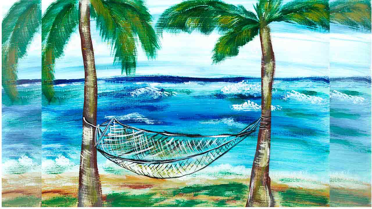 Как нарисовать морской пейзаж. Нарисуем пальмы. Нарисуем гамак. Как нарисовать пальмы.