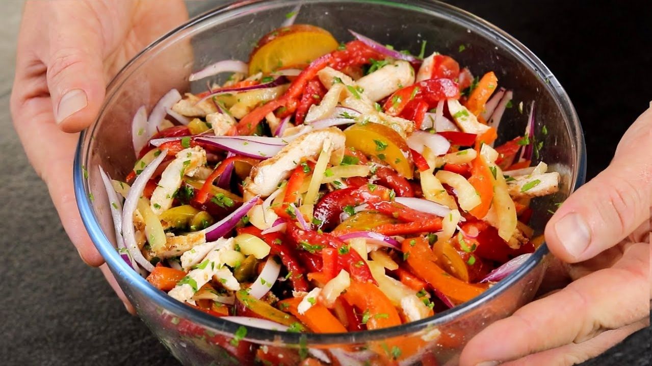 В конце лета мы подсели на этот Салат! Новенький Свежий салатик за 10 МИНУТ Рецепт: Куриная грудка - 400 г Соль - 1/2 ч.л. Черный перец Паприка - 1/2 ч.л. Растительное масло - 1 ст.л. Сладкий перец - 2 шт Помидоры - 4 шт Лук красный - 1 шт Сливы кислые - 4 шт Петрушка Соль Черный перец Растительное масло - 4 ст.л. —————————————————————— праздничный салат, салат, рецепт, рецепты, вкусныйсалат, рецепты салатов, салаты, празднчинй, мясной салат, без майонеза,