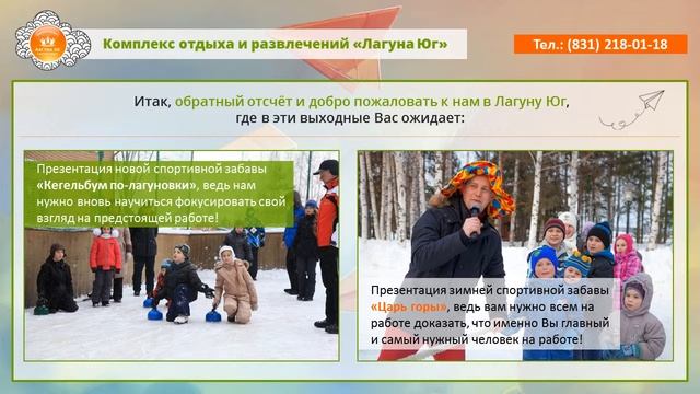 За новогодние праздники русский человек научился хорошо отдыхать и разучился хорошо работать, поэтому к суровым трудовым будням обычно готова лишь малая часть. Тем самым, перед человеком встаёт самая сложная задача, как заставить себя оторваться от стола и подняться с дивана, вспомнить дорогу на работу и набрать полные рабочие обороты. Именно поэтому, КОиР «Лагуна Юг» и подготовил специальную программу отдыха «Идём на взлёт!», которая и позволит Вам, в отличие от ваших конкурентов, войти с реактивной скоростью в рабочие будни. В эти дни, мы сделали особый акцент на презентации наших очередных анимационных идей, которые всегда поднимают настроение и учат чему то новому!