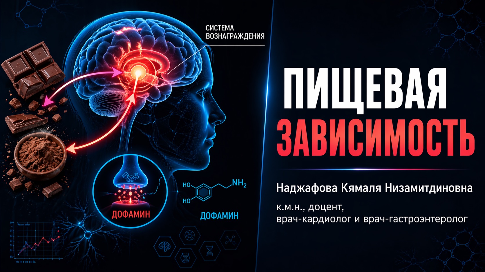 Почему нас тянет к сладкому? Можно ли «подсесть» на шоколад? И как стресс управляет нашим аппетитом? В этом разборе обсуждаем нейробиологию пищевого поведения и механизмы формирования пищевых привычек с позиции современной медицины. 👩⚕️ Спикер: Наджафова Кямаля Низамитдиновна — кандидат медицинских наук, доцент кафедры пропедевтики внутренних болезней с клиникой Лечебного факультета Института медицинского образования ФГБУ «НМИЦ им. В.А. Алмазова» Минздрава России (Санкт-Петербург). 📌 В видео разберём: • Существует ли зависимость от еды с точки зрения работы системы вознаграждения мозга • Чем пищевые аддикции отличаются от зависимостей к психоактивным веществам • Почему именно сахар и шоколад — наиболее изученные «триггеры» • Как стресс влияет на пищевое поведение и переедание • Что такое эмоциогенное питание • Как выглядит современный подход к пациентам с пищевыми аддикциями