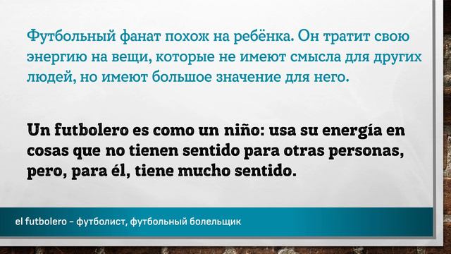 Урок основан на эпизоде подкаста взятом на сайте http://podcast.duolingo.com Полная ссылка на эпизод подкаста с транскрипцией: https://podcast.duolingo.com/episode-15-nuestro-naranjito Уроки начинающиеся на "№##duolesp*****" имеют уровень сложности A1-A2 и латиноамериканский акцент. Данный материал предназначен исключительно в образовательных целях. Данный материал был частично синтезирован с помощью искусственного интелекта. Цель – заставить мышление учащегося формировать фразы, части фраз, на испанском языке. Каждая фраза повторяется три раза. Повторения происходит не подряд, а с некоторым "смещением", заставляя всё время мысленно переключаться на другую фразу. Пауза между фразами служит для того, чтобы вспомнить хотя бы одно слово, часть фразы или всю фразу на испанском языке. Чем длиннее фраза на русском языке – тем длиннее пауза до фразы на испанском языке. Достаточно, если человек самостоятельно начинает формировать хотя бы кусочки фразы, некоторые слова. Данный вид упражнений не стоит делать более одного часа за один раз. Достаточно прослушивать такие упражнения в фоновом режиме: замимаясь домашними делами, находясь в дороге или на прогулке, занимаясь спортом. Чтобы выучить любой язык необходимо «провести с ним» 10 000 часов. #испанский #испания #слова #фразы #aprender #español #españa #español #испанскийязык #испанскийбесплатно #испанскийэффективно #учимиспанский #испанскийучить #shadowing #ShadowingTechnique #Lerntechnik #произношение #грамматика #subjuntiv #expresiones #shadowingmethode #эффективно #españolonline #españoloffline #aprenderespanolonline #pimsleur #paulpimsleur Слова и выражения из этой части подкаста: ================================================ Naranjito - Апельсинчик acumular - накапливать, собирать clasificar - сортировать, подразделить, распределять crucial - решающий, важнейший, ключевой el compañero - напарник, приятель, друг el espectador - зритель el espejo - зеркало el fin del mundo - конец света el futbolero - футболист, футбольный болельщик el gol - гол el juguete - игрушка el partido - матч, игра, игровая партия el silencio - молчание, тишина, тишь el talismán - талисман, амулет explicar - объяснять izquierdo - левый la Copa Mundial - Кубок Мира, чемпионат мира la escalera - лестница la madrugada - рассвет la pelota - мяч la suerte - удача meter un gol - забивать гол supersticioso - суеверный un loco - безумный, сумашедший una media hora - полчаса