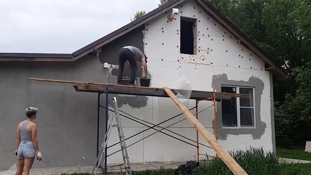 В этом видео мы покажем как сделали штукатурку фасада своими руками. Наш дом утеплен пенопластом и мы оштукатурили его по сетке в два слоя и нанесли декоративную штукатурку короед