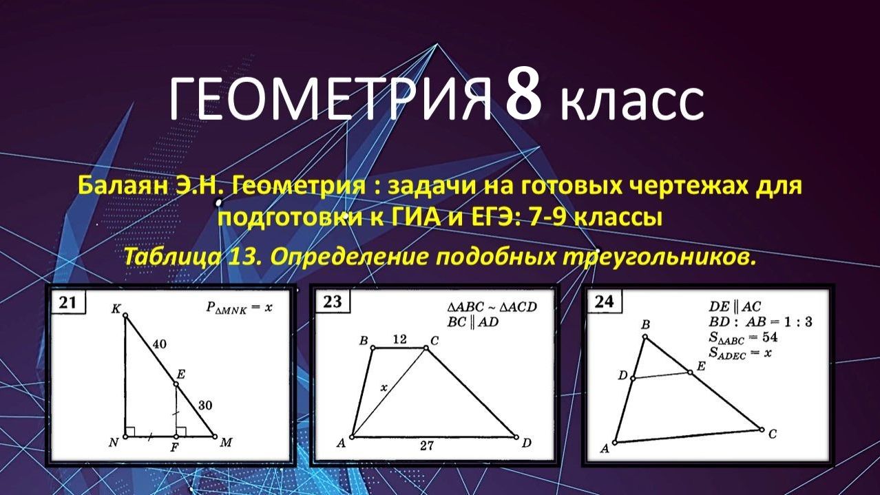 https://dzen.ru/profile/editor/irinaklok https://vkvideo.ru/@club228129393 Геометрия 8 класс по учебнику Атанасяна. В этом видео решаем задачи из сборника Балаяна Э.Н. Геометрия: задачи на готовых чертежах для подготовки к ГИА и ЕГЭ: 7-9 классы. Таблица 13. Определение подобных треугольников. Найдите х, y, z. 00:00:00 Задача 21 00:30:21 Задача 23 00:45:38 Задача 24