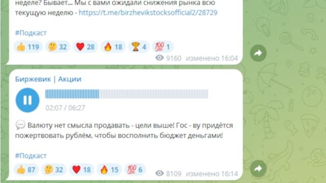 Инфоцыгане загнали вас в лонги по рынку на предыдущей неделе? Бывает... Мы с вами ожидали снижения рынка всю текущую неделю - https://t.me/birzhevikstocksofficial2/28729 Валюту нет смысла продавать - цели выше! Гос - ву придётся пожертвовать рублём, чтобы восполнить бюджет деньгами! #Подкаст
