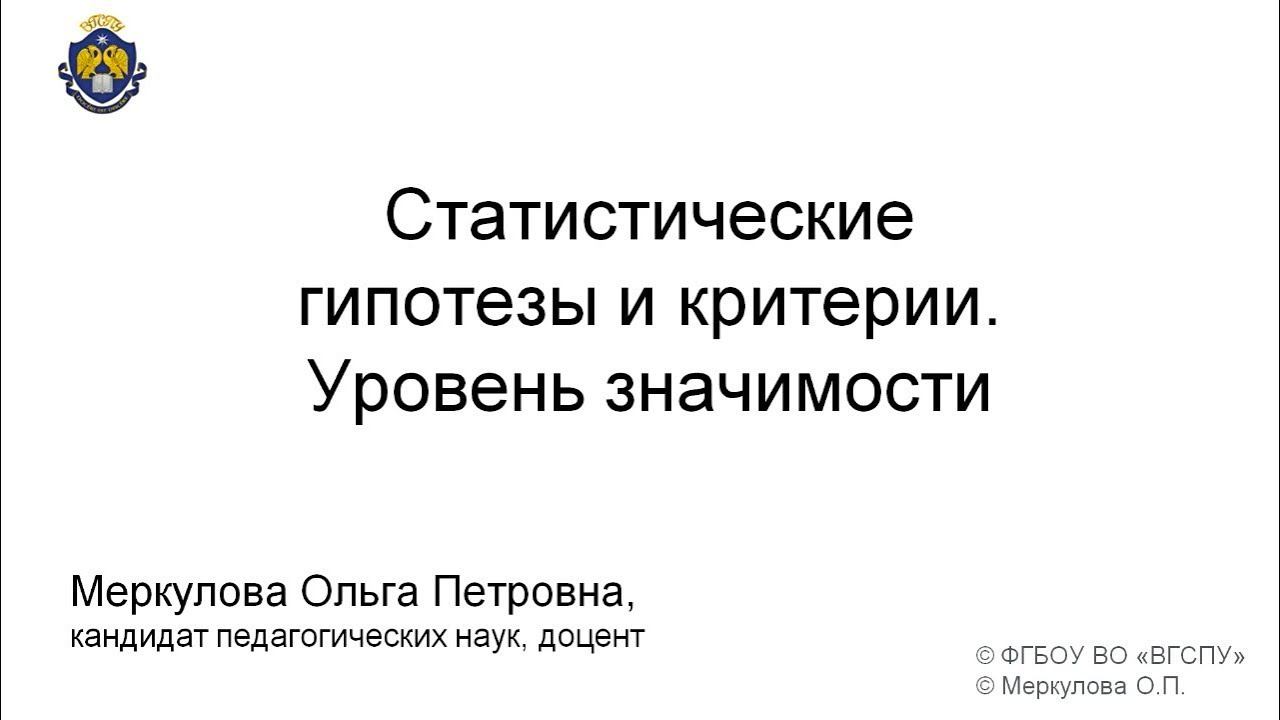 Статистические гипотезы и критерии Уровень значимости
