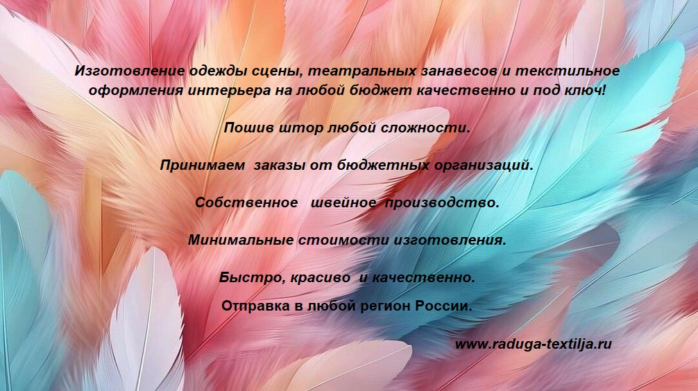 Шторы для театра, шторы для сцены, театральные шторы: Театральный занавес Шторы для театра Занавес для сцены Сценический занавес Портьера для сцены Одежда сцены Одежда сцены - Занавес, арлекин, кулисы, падуги, задник – все это вместе составляет одежду сцены Одежда сцены - это занавеси из ткани для украшения и разделения пространства, которые состоят из следующих элементов: сценический занавес (антрактный) кулисы - тканевые занавеси по бокам сцены арлекин - лицевая падуга сцены, падуги - горизонтальные занавеси из ткани, закрывающие световые приборы задник - элемент, который создает фон Оформляем театры, концертные залы, кинозалы, культурные центры, дворцы и дома культуры, актовые залы школ, колледжей, ВУЗов, спортивные залы и площадки. Шторы для театра, шторы для сцены, театральные шторы: Театральный занавес Шторы для театра Занавес для сцены Сценический занавес Портьера для сцены Одежда сцены Одежда сцены - Занавес, арлекин, кулисы, падуги, задник – все это вместе составляет одежду сцены Одежда сцены - это занавеси из ткани для украшения и разделения пространства, которые состоят из следующих элементов: сценический занавес (антрактный) кулисы - тканевые занавеси по бокам сцены арлекин - лицевая падуга сцены, падуги - горизонтальные занавеси из ткани, закрывающие световые приборы задник - элемент, который создает фон Оформляем театры, концертные залы, кинозалы, культурные центры, дворцы и дома культуры, актовые залы школ, колледжей, ВУЗов, спортивные залы и площадки. www.raduga-textilja.ru