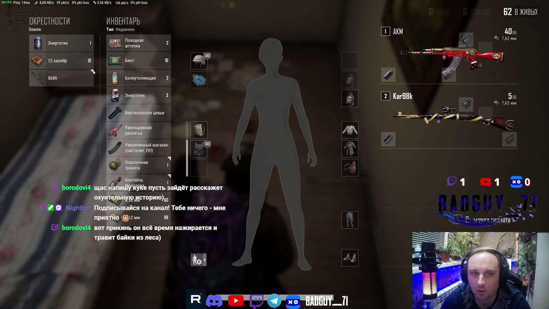 Поддержать стримера: https://www.donationalerts.com/r/badg... Карта для прямого доната: 2200 3005 6657 3711 Канал на Twitch: / badguy_71 Мой телеграм канал: https://t.me/badguy_71 Мой Kick: https://kick.com/badguy-71 Мой VK Play: https://live.vkplay.ru/badguy_71 Всем привет! Зовут Дима, 41 годик, играю в pubg много и с удовольствием. Стримы каждый день. Мой компьютер Процессор Intel Core i5-11400F Видеокарта Palit GeForce RTX 3060 Ti Оперативная память 32 gb