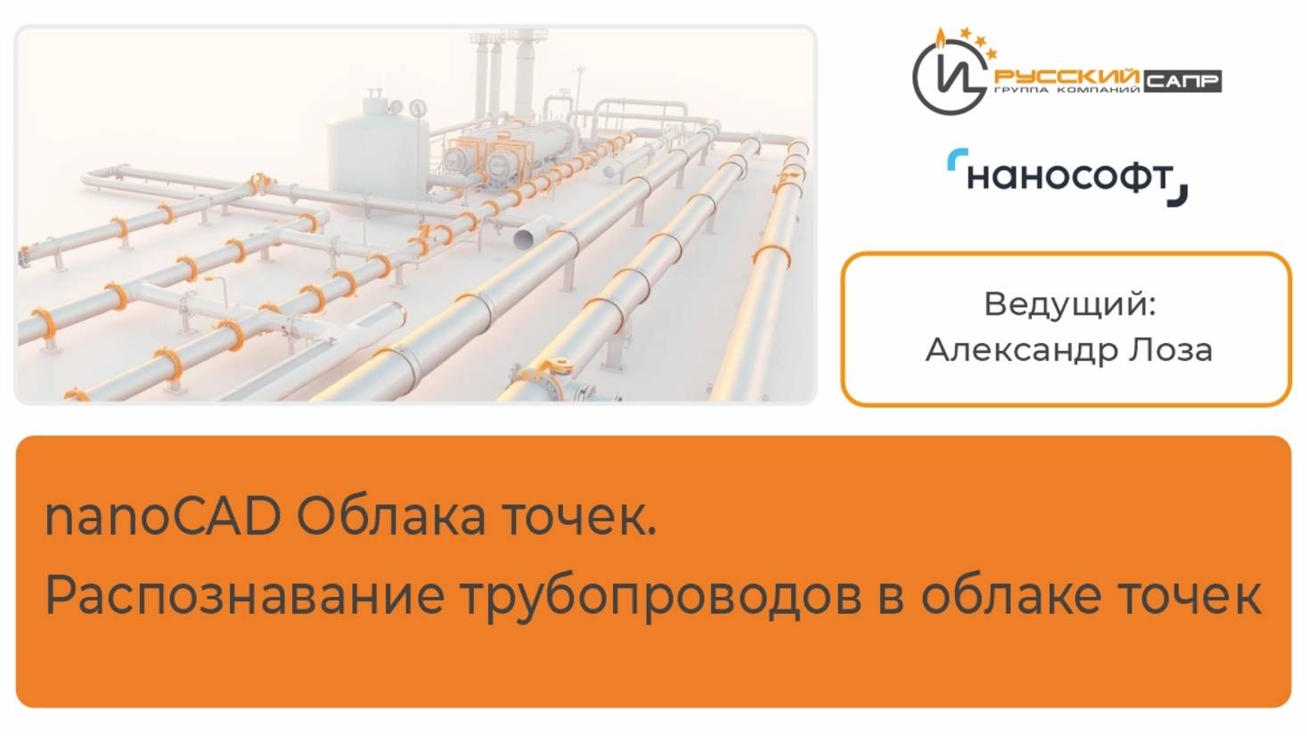 ☁️ Запись вебинара "nanoCAD Облака точек. Распознавание трубопроводов в облаке точек". Вебинар проводит АО «Бюро САПР» (входит в Группу компаний «Русский САПР»). Премьер-партнёр компании «Нанософт разработка» и Фокус-партнёр по направлениям «Инженерия», «Конструкции», «Землеустройство», «Машиностроение» и «Обработка данных лазерного сканирования». На вебинаре была продемонстрирована подготовка облака, инструментарий ручного и автоматического распознавания, а также работа в редакторе форм. ❓Для кого: для инженеров, занимающихся проектированием трубопроводных систем с использованием облаков точек (данных, полученных в результате лазерного сканирования). Программа вебинара: ✅Предварительная обработка облака ✅Ручное распознавание трубопроводов ✅Варианты построения трубопроводов ✅Автоматизированное распознавание трубопроводов ✅Использование редактора форм: удаление лишних форм, корректировка геометрии форм, добавление отводов, добавление тройников ✅Ответы на вопросы Ведущий: Александр Лоза