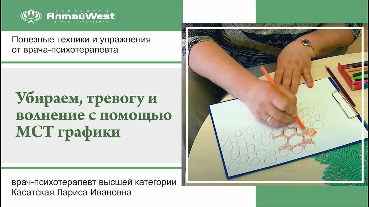 https://altai-west.ru/methods/psikhoterapiya/ Попробуйте одну из техник, которую рекомендует психотерапевт высшей категории санатория "Алтай-West" Лариса Ивановна Касатская. Техника МСТ-графика помогает справиться с беспокойством и тревогой, обрести легкость и внутреннюю гармонию. Техника рассчитана на самостоятельное выполнение. Вам понадобится: - чистый лист бумаги, - цветные карандаши или фломастеры, - стирательная резинка.