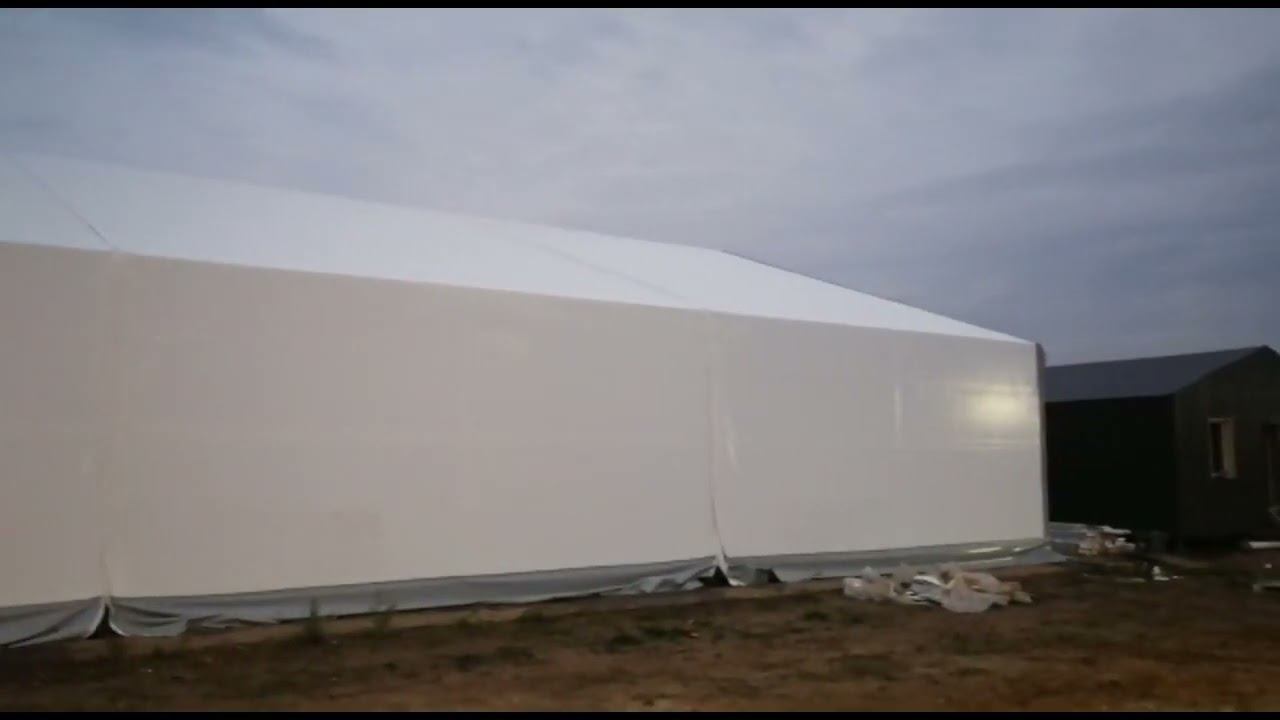 Завершающая стадия натяжения верхнего слоя ПВХ материала на ангаре.