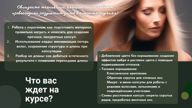 ❌Забудьте о сложных и непонятных инструкциях по наращиванию волос!❌ Наш онлайн-курс🔥 – это ваше персональное руководство к успеху, разработанное опытными мастерами с многолетней практикой. ✅Мы гарантируем, что после его прохождения вы сможете профессионально наращивать волосы, радуя себя и своих клиентов безупречным результатом. Курс представляет собой серию подробных видеоуроков, доступных вам 24/7 и навсегда. Мы уделили особое внимание каждой детали, каждой мелочи в работе.✅ В курс включены практические советы по организации рабочего места, подбору необходимого инструментария и материалов, а также детальный разбор наиболее распространенных ошибок новичков и способов их предотвращения. Мы не просто показываем, как делать – мы объясняем почему. Вы поймете принципы работы каждой техники, что позволит вам адаптироваться к различным ситуациям и творчески подходить к процессу наращивания. ‼️Предлагаем два варианта курса: * **Стандартный курс:** Предоставляет неограниченный доступ ко всем видеоурокам. Это идеальный вариант для тех, кто уверен в своих силах и предпочитает самостоятельное обучение. Вы получаете все необходимые знания и навыки, чтобы начать свою карьеру или совершенствовать существующие умения. * **Курс с круглосуточной поддержкой:** В дополнение ко всем видеоурокам стандартного курса, вы получаете неограниченную поддержку наших опытных преподавателей 24/7. Вы сможете задавать вопросы, отправлять фотографии своих работ для оценки и получать персональные рекомендации. Это значительно ускорит ваше обучение и поможет избежать ошибок, гарантируя быстрый и качественный результат. Наши преподаватели всегда на связи, готовы ответить на ваши вопросы и помочь в сложных ситуациях. ✅Какой бы вариант вы ни выбрали, вы получите максимально комфортные условия для обучения. ‼️Не откладывайте свою мечту! Начните свой путь к успеху прямо сейчас! Запишитесь на наш онлайн-курс и станьте востребованным мастером по наращиванию волос! #наращиваниеволособучение #онлайнобучение #курсынаращиванияволос #онлайнкурсы #наращивание #волосы #капсулы
