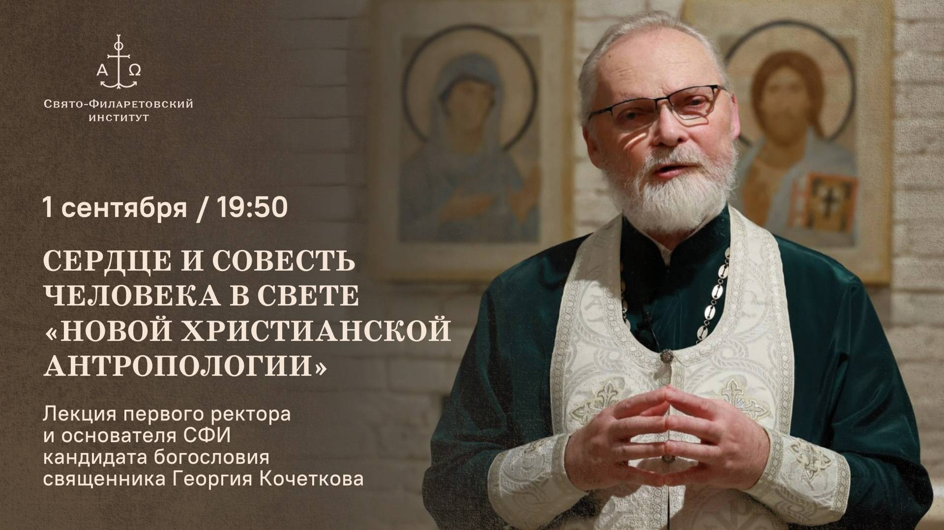 1 сентября в 19:50 Приветственное слово и напутствие первокурсникам ректора к.пед.н. Александра Михайловича Копировского Лекция основателя и духовного попечителя Свято-Филаретовского института, кандидата богословия проф. свящ. Георгия Кочеткова «Сердце и совесть человека в свете “Новой христианской антропологии”»